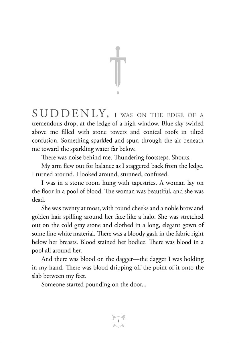 Book design for a novel in which a writer finds himself mysteriously shifting back and forth between his struggling-writer life in LA, and a medieval world of palace intrigue, where he has committed a murder. The design integrates some elements from the book cover.