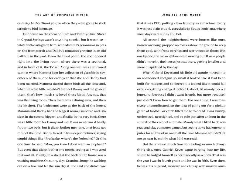 Book interior for The Art of Dumpster Diving by Sarah J. Carlson, for Turner Publishing. A set of talkative pet parrots play an interesting role in the text. My favorite part of this project was choosing a section break graphic (paperclips) whose significance would not be revealed until the end of the novel.