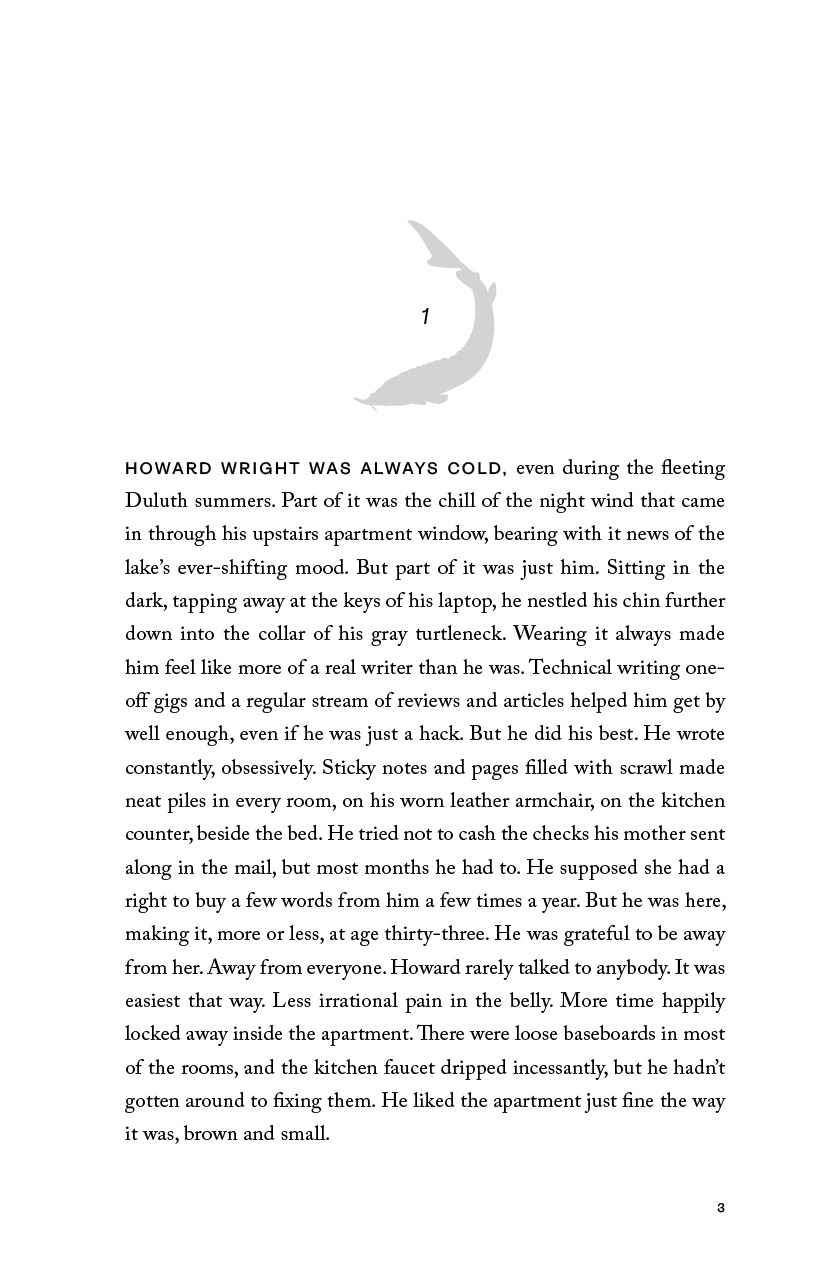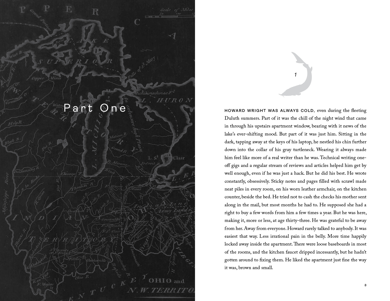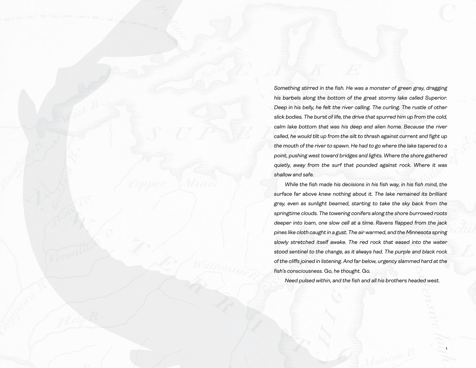 Book design for a novel involving a "monster" set against the natural backdrop of Lake Superior in Minnesota.