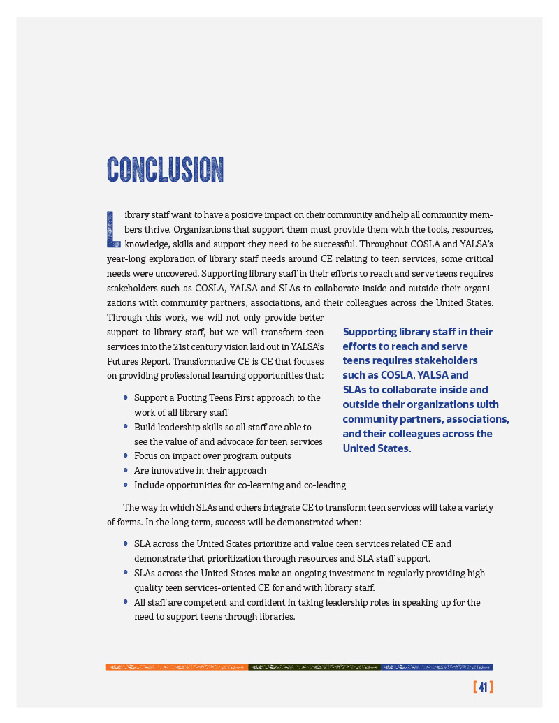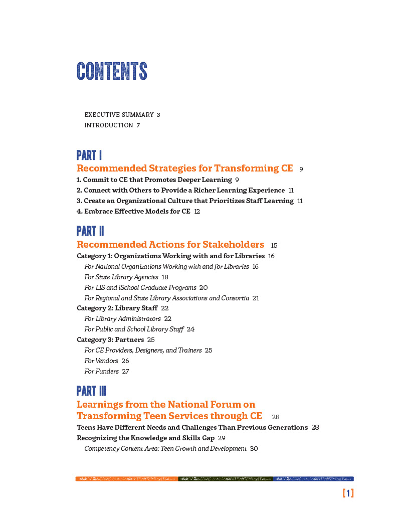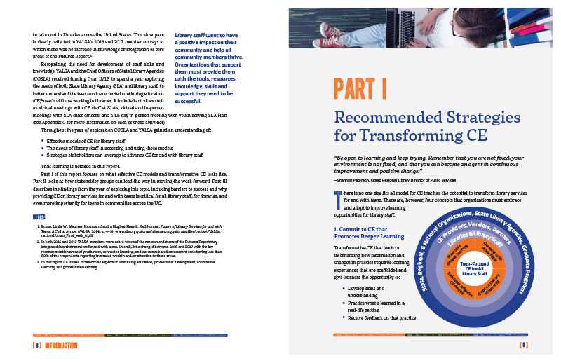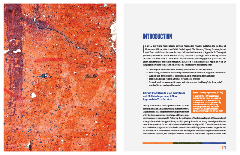 A guide to teen library services with text elements including tables, sidebars, and infographics. Client: Young Adult Library Services Association.