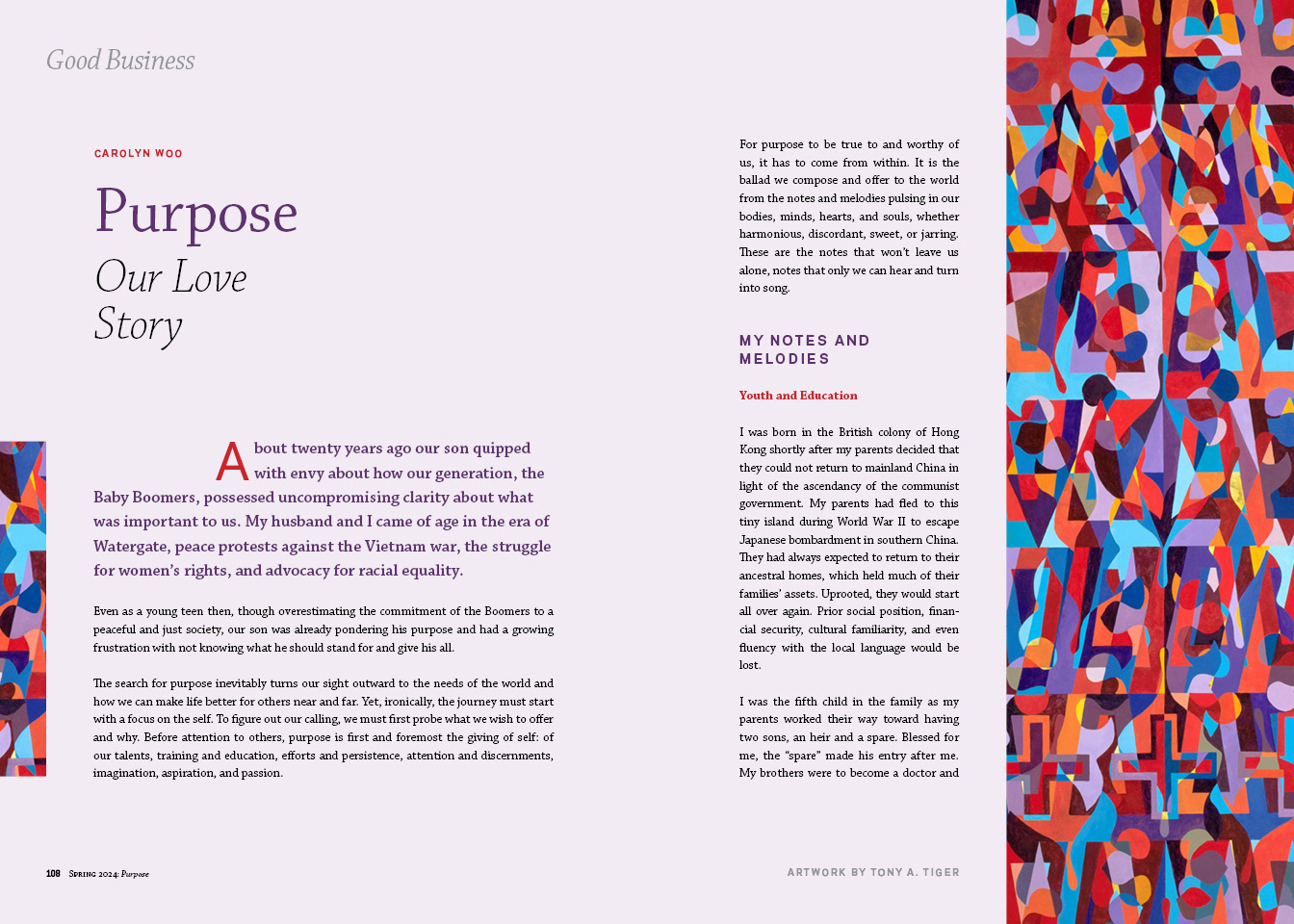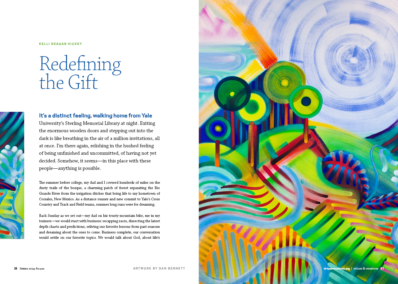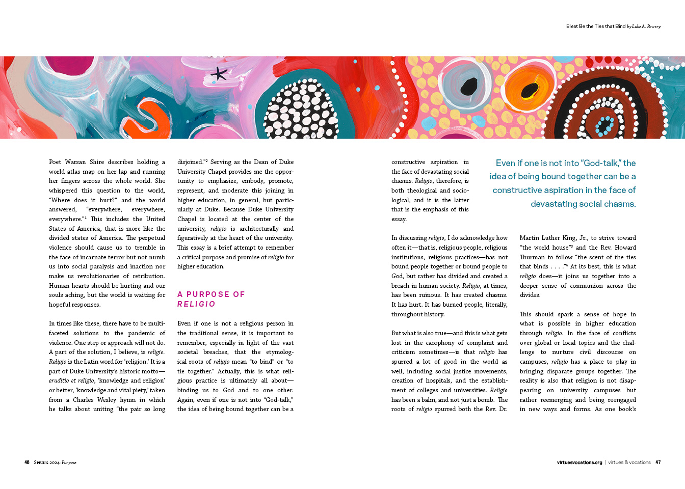 I designed the template for and lay out this semi-annual journal for Notre Dame's Center for Social Concerns. The audience is academics and the essays tackle ethical and philosophical issues in higher education and academia. Issues are 100-140 pages, comprised of essays paired with contemporary artwork. I collaborate on visual theme identification, conduct art research and coordinate all the logistics with the artists, including outreach, the writing and execution of contracts, and organizing payment paperwork and credits.