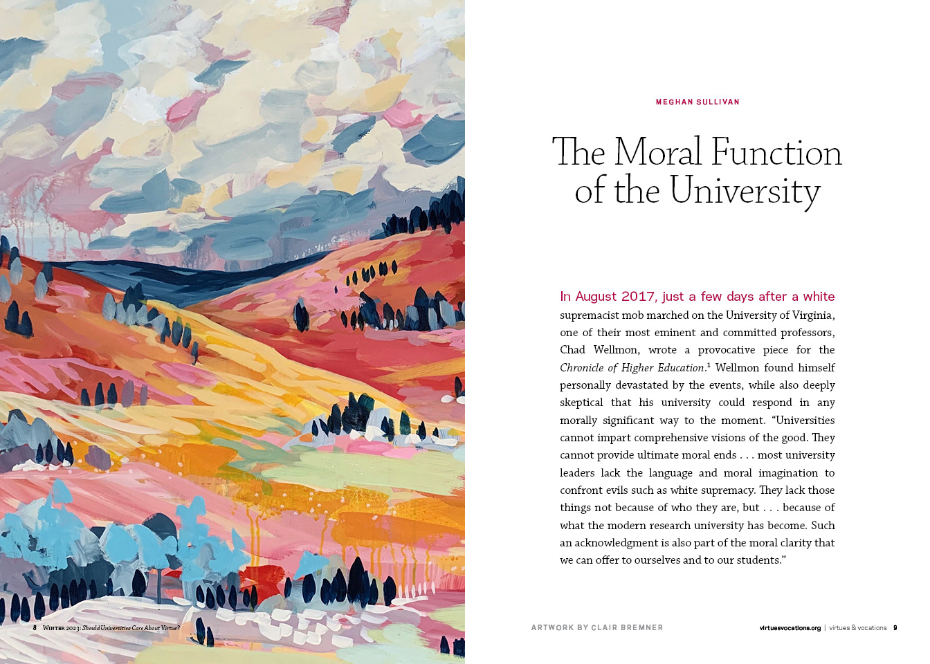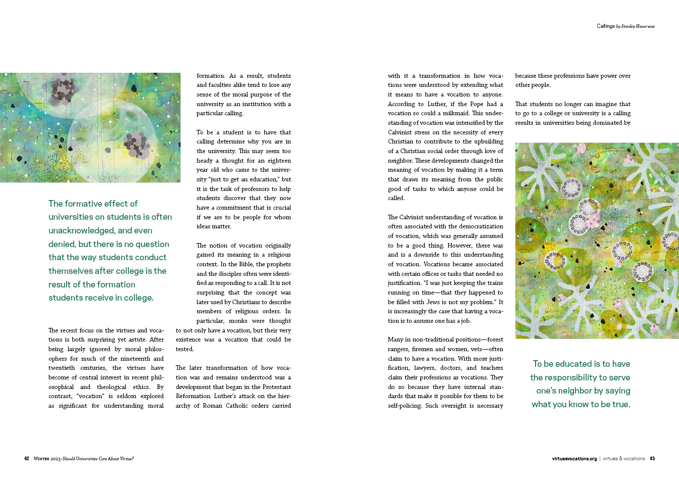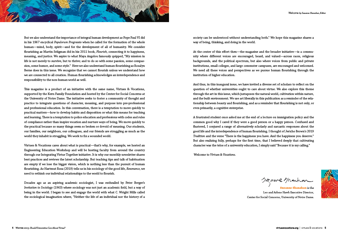 I designed the template for and lay out this semi-annual journal for Notre Dame's Center for Social Concerns. The audience is academics and the essays tackle ethical and philosophical issues in higher education and academia. Issues are 100-140 pages, comprised of essays paired with contemporary artwork. I collaborate on visual theme identification, conduct art research and coordinate all the logistics with the artists, including outreach, the writing and execution of contracts, and organizing payment paperwork and credits.